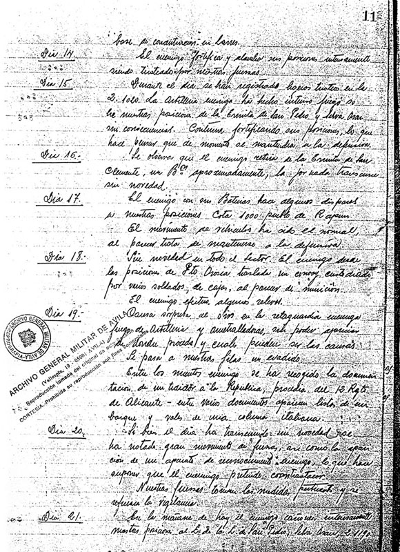 | Contenido: Diario de operaciones del estado mayor de la 72ª Brigada Mixta. Se producen movimientos de tropas y se encuentra documentación del 12º Regimiento de Alicante en la que hay vales de una columna italiana. Se observa un avión de reconocimiento franquista. |