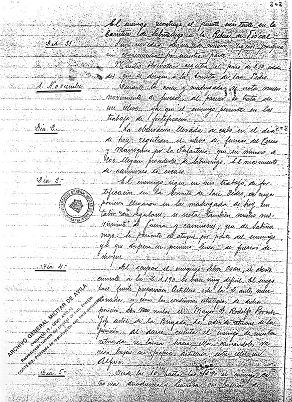 | Contenido: Diario de operaciones del estado mayor de la 72ª Brigada Mixta. Se observa gran movimiento de tropas en torno a la posición de la ermita de San Pedro, tropas marroquíes y fuerzas de choque que hacen preveer un ataque. Ante la difícil defensa de la cota 1190 el jefe de brigada accidental Rodolfo Bosch ordena la retirada de la misma. |