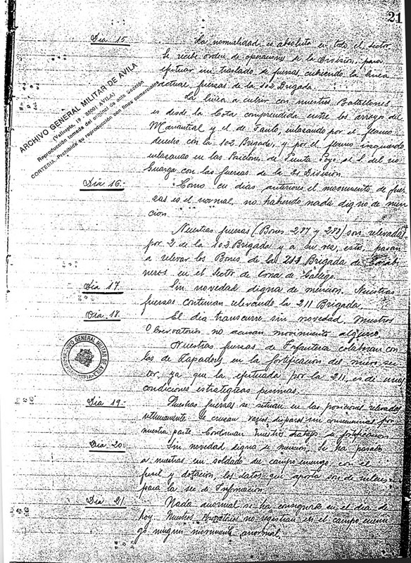 | Contenido: Diario de operaciones del estado mayor de la 72ª Brigada Mixta. Se produce algún tiroteo aislado sin consecuencias. Se reciben órdenes de la División para trasladar fuerzas y se producen algunos relevos. |