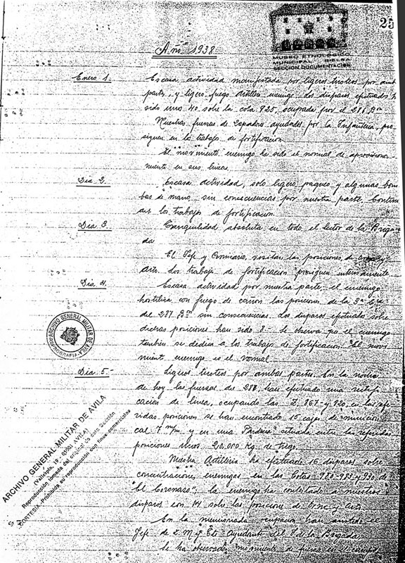 | Contenido: Diario de operaciones del estado mayor de la 72ª Brigada Mixta. Continuan los trabajos de fortificación de las posiciones de uno y otro bando. Se encuentra munición y alimentos en posiciones abandonadas. Al final de la jornada se produce algún tiroteo en las posiciones de Orna y Arto, presenciándolas el Jefe Mayor de Brigada y el Comandante Ayudante. |