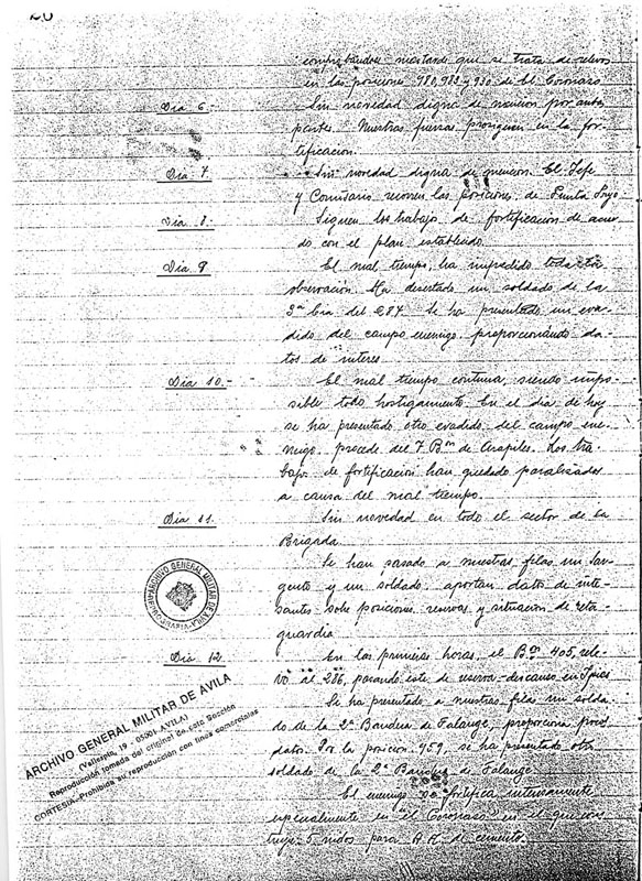 | Contenido: Diario de operaciones del estado mayor de la 72ª Brigada Mixta. El Jefe de Brigada y el Comisario realizan una visita por las posiciones, produciéndose algunos relevos de tropas. Se producen varias deserciones pero llegan algunos soldados y oficiales desde las líneas franquistas procedentes del 7º Batallón de Arapiles y 2ª Bandera de Falange. |