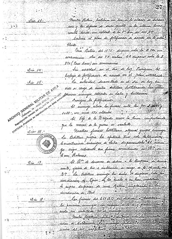 | Contenido: Diario de operaciones del estado mayor de la 72ª Brigada Mixta. Prosiguen los trabajos de fortificación de las posiciones. Se realiza el ataque a un tren estacionado en Caldearenas. |