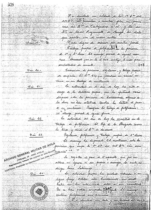| Contenido: Diario de operaciones del estado mayor de la 72ª Brigada Mixta. Prosiguen los trabajos de fortificación de las posiciones. Se producen algunas deserciones y se pasan a filas republicanas algunos soldados procedentes del Batallón de Trabajadores y del Batallón nº2 del Regimiento de Burgos. El jefe de Brigada realiza una visita al batallón de descanso y se observan quince aviones que van hacia Sabiñánigo. |