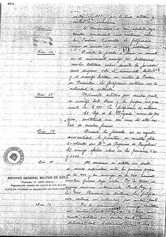 | Contenido: Diario de operaciones del estado mayor de la 72ª Brigada Mixta. Prosiguen los trabajos de fortificación de las posiciones y hay enfrentamientos diversos que se intensifican a lo largo de la jornada. El Jefe de Brigada recorre las posiciones en labores de supervisión. Se pasan a filas republicanas dos soldados del Batallón de Ingenieros de Pamplona. |