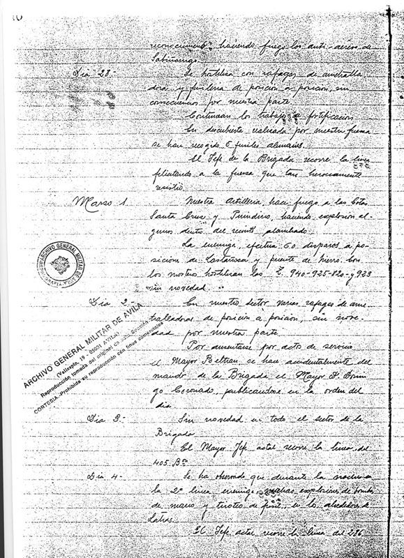 | Contenido: Diario de operaciones del estado mayor de la 72ª Brigada Mixta. Continúan los trabajos de fortificación y se realiza algún ataque sobre las posiciones enemigas. El jefe de brigada Antonio Beltrán Casaña al ausentarse por motivos de servicio deja al mando al mayor Domingo Coronado. |