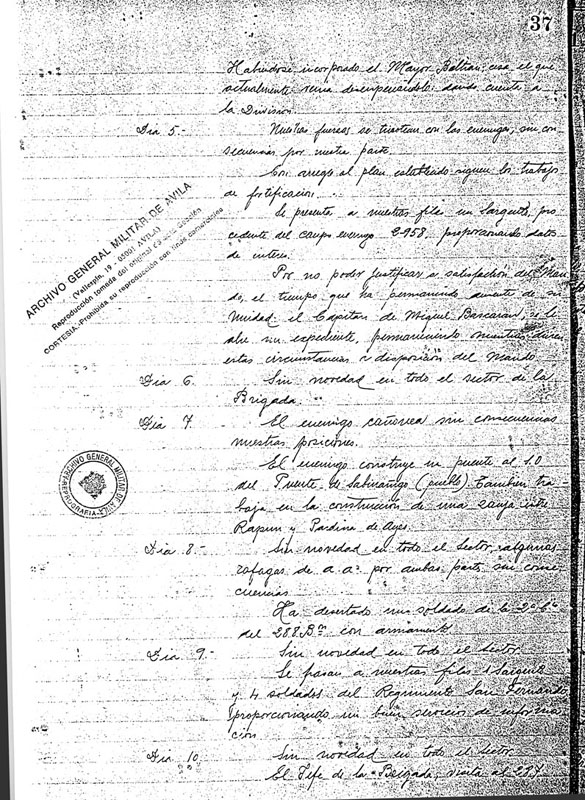 | Contenido: Diario de operaciones del estado mayor de la 72ª Brigada Mixta. Continúan los trabajos de fortificación y se produce algún enfrentamiento aislado. El jefe de brigada Antonio Beltrán Casaña se incorpora a las labores de mando. Se pasan a filas republicanas dos Sargentos y varios soldados, pero también hay varias deserciones y se abre un expediente al capitán Miguel Bascarán. En los trabajos de observación se detecta que las tropas franquistas han construido un puente al suroeste de Sabiñánigo. |