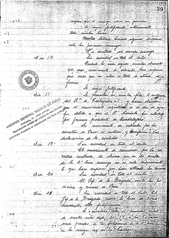 | Contenido: Diario de operaciones del estado mayor de la 72ª Brigada Mixta. Continúan los trabajos de fortificación y se produce algún enfrentamiento aislado, observando gran movimiento de vehículos enemigos en torno a Jaca. El jefe de brigada Antonio Beltrán Casaña visita las posiciones y reservas de Ipiés. El día 21 de marzo se moviliza a toda la población civil entre 17 y 50 años para trabajar en la fortificación de la segunda línea de la margen izquierda del río Gállego. |
