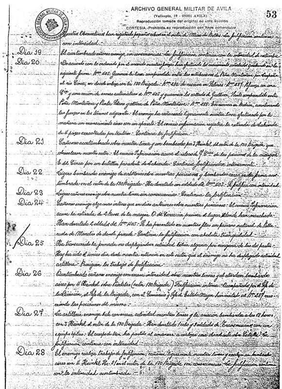 | Contenido: Diario de operaciones del estado mayor de la 72ª Brigada Mixta. Hay intenso cañoneo de la artillería enemiga y Puértolas es bombardeada por aparatos Heinkel He-51. Por orden del mando se reestructura la línea defensiva y las posiciones de los batallones. Se produce una visita en la posición del Batallón 287º de el Jefe de División, Jefe de Brigada, Comisario y Jefe de Estado Mayor. |