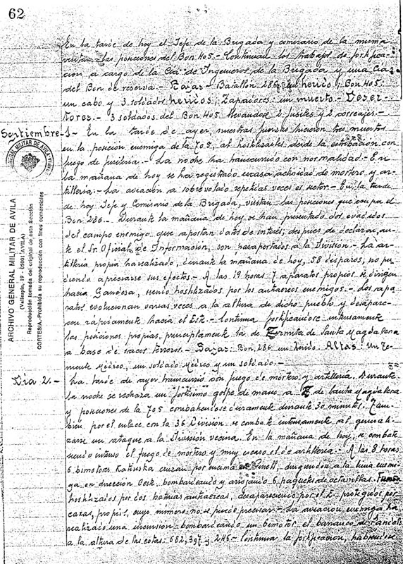| Contenido: Diario de operaciones del estado mayor de la 72ª Brigada Mixta. Prosiguen los trabajos de fortificación de las posiciones. La aviación republicana, con 6 bimotores Tupolev SB-2 (Katiuska), bombardean las posiciones enemigas y lanzan octavillas sobre ellas. |