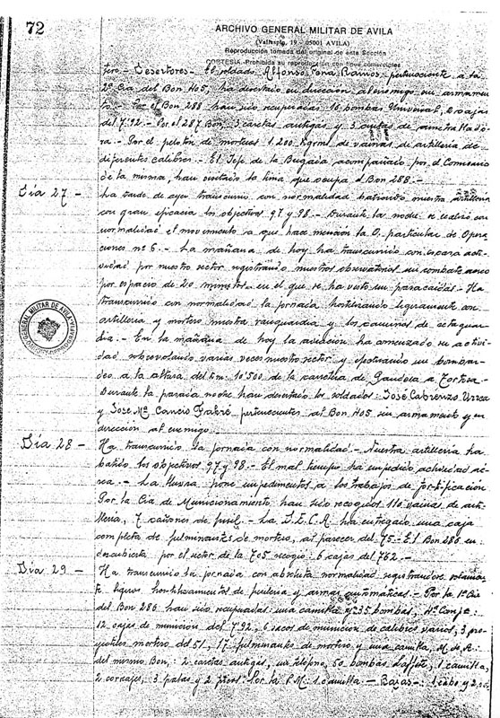 Contenido: Diario de operaciones del estado mayor de la 72ª Brigada Mixta. En varias descubiertas se recupera armamento y material. Se produce la visita del Jefe de Brigada y del Comisario en las posiciones, desde las que se observan combates aéreos avistando algún paracaídas. Se producen las deserciones de Alfonso Fena Ramos, José Cabrerizo Urrea y José Mª Cancio Fabré. Referencia a la J.E.C.A. |