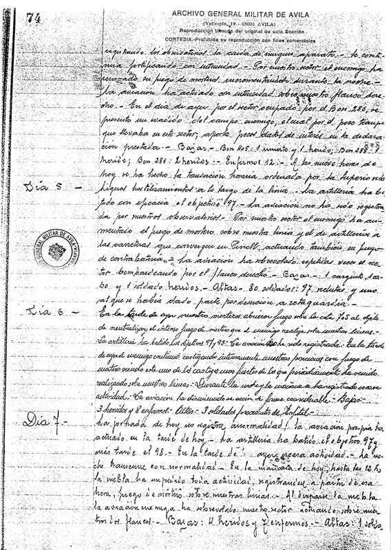 | Contenido: Diario de operaciones del estado mayor de la 72ª Brigada Mixta. Se producen diversos enfrentamientos con las tropas franquistas, con intervención de fuego de morteros y aviación. A medida que pasa la jornada se intensifican los ataques enemigos. |