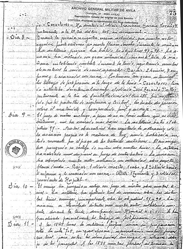 | Contenido: Diario de operaciones del estado mayor de la 72ª Brigada Mixta. Se producen diversos enfrentamientos con las tropas franquistas, con intervención de fuego de morteros y aviación, con aparatos Heinkel He-51. Desiertan los soldados Francisco García Foradell del 405º Batallón y José Teixidó Vallés de la Compañía de Ametralladoras del 286º Batallón, muerto por disparos de las patrullas de vigilancia y control. |