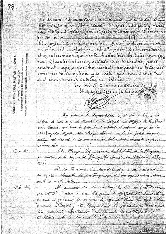 | Contenido: Diario de operaciones del estado mayor de la 72ª Brigada Mixta. Cesa en el mando de la jefatura de brigada Vicente Amaro Cuervo García el 20 de octubre de 1938 y se hace cargo de la misma el mayor José Herraiz Serrano, que hasta esa fecha lo había sido de la 130ª Brigada Mixta. |