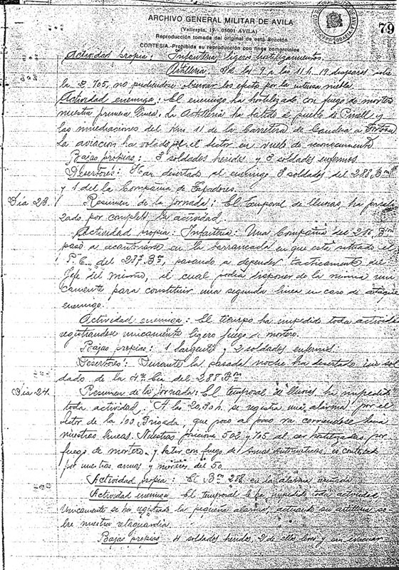 | Contenido: Diario de operaciones del estado mayor de la 72ª Brigada Mixta. Se producen enfrentamientos con las tropas franquistas pero con poca intensidad debido al temporal de lluvias. |