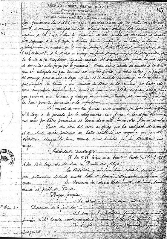 | Contenido: Diario de operaciones del estado mayor de la 72ª Brigada Mixta. Se producen numerosos enfrentamientos de gran intensidad debido a una ofensiva franquista sobre las posiciones de la Brigada. Hay numerosa actividad de la aviación. Logran ocupar la posición 666, donde izan la bandera bicolor. |