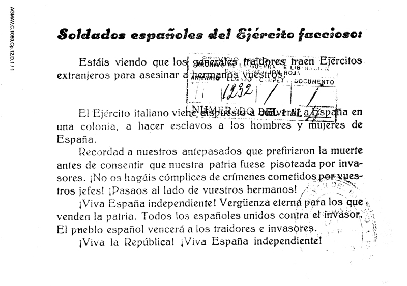 | Contenido: Propaganda lanzada a las líneas del ejercito franquista por parte de una compañía del primer batallón de la 102ª Brigada Mixta. Hace referencia a la intervención del ejército italiano. |