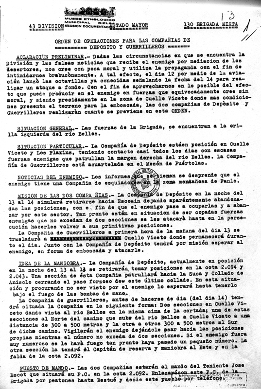 | Contenido: Orden de operaciones del Estado Mayor de la 130ª Brigada Mixta. Órdenes tácticas a las dos compañías mencionadas, en las que se describe una maniobra consistente en la realización de un falso repliegue y posterior emboscada del enemigo en avance. |