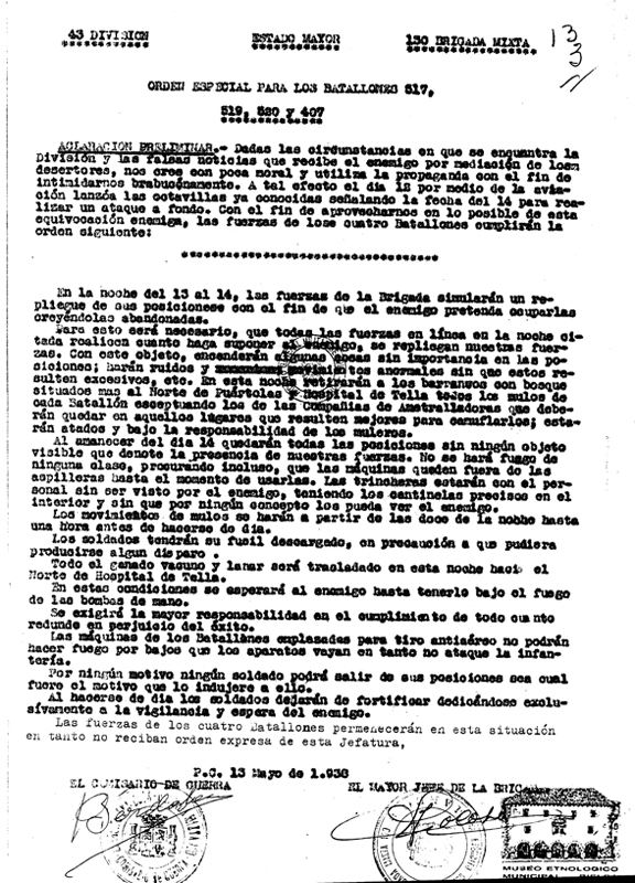 | Contenido: Orden especial para los batallones 517º, 519º, 520º y 407º. Orden táctica a las unidades mencionadas, en las que se describe una maniobra consistente en la realización de un falso repliegue y posterior emboscada del enemigo en avance. |