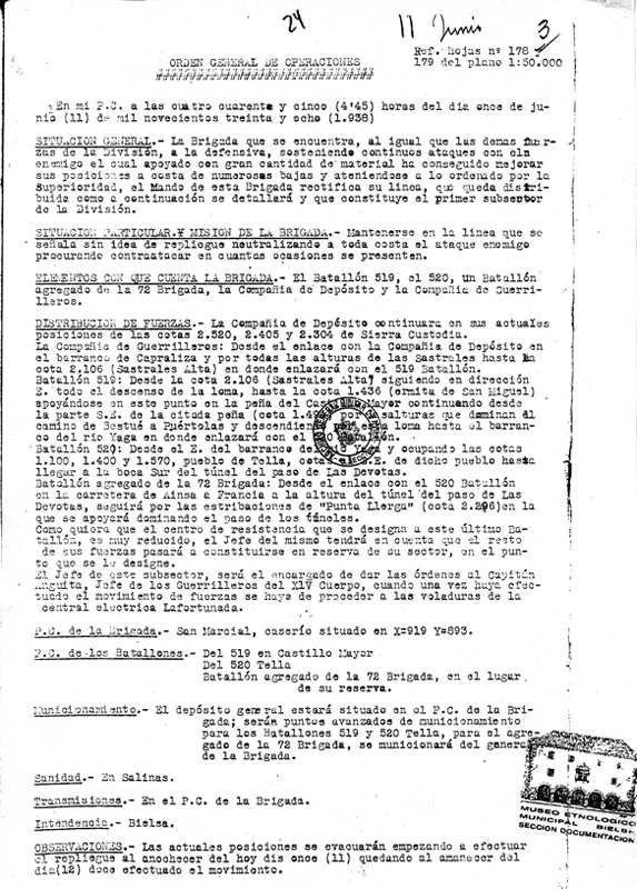 | Contenido: Se describen las órdenes de evacuación de las posiciones actuales y nuevo despliegue para las unidades de la brigada, indicando las líneas correspondientes. Se dan instrucciones para la destrucción de la central eléctrica de Lafortunada. |