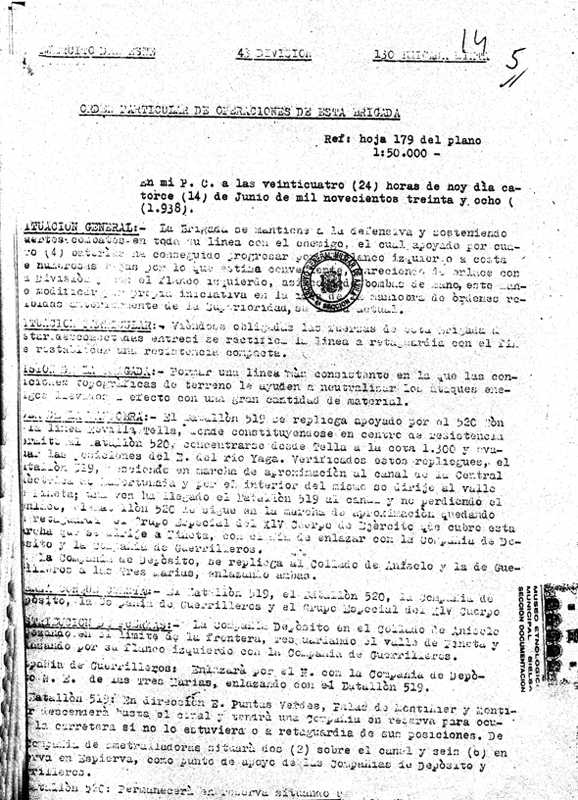 | Contenido: Despliegue de las unidades de la brigada en el valle de Bielsa y cuenca del Cinca. Repliegue de los batallones 519º y 520º hacia Tella y de otras unidades hacia el collado de Añisclo y valle de Pineta. |
