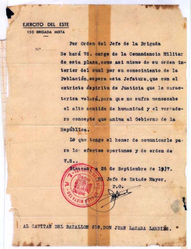 | Contenido: Escrito del jefe de Estado Mayor de la 130ª Brigada Mixta en el que se le da la comandancia militar al capitán del Batallón 519º Juan Lacasa Lardiés de la plaza de Biescas. |