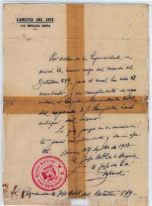 | Contenido: Escrito dirigido al Comandante del batallón para que se haga cargo del mismo. Le entrega el cargo J. Sampietro. Se nombra así, a Juan Lacasa Lardiés como jefe de batallón, sustituyendo a Telmo Mompradé. |