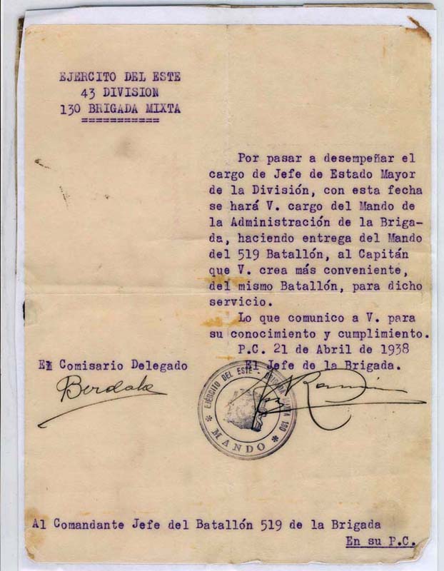 | Contenido: Nombramiento del mando de la 130ª Brigada Mixta por parte de Leopoldo Ramírez Jiménez a Juan Lacasa Lardiés. Leopoldo Ramírez Jiménez es el cargo saliente, puesto que ha sido nombrado jefe de Estado Mayor de la 43ª División. |