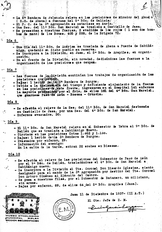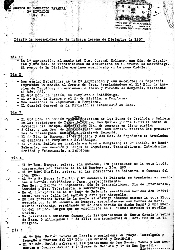 | Contenido: Diario de operaciones de la primera decena de diciembre de 1937. Se establece el cuartel general de la División en Jaca, se producen los diferentes relevos de Batallón. Se producen los primeros casos de evadidos del lado republicano y se desiga al teniente coronel Ricardo Iglesias al mando de la 3ª Agrupación. |