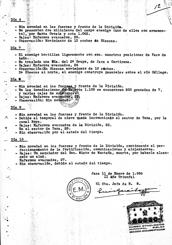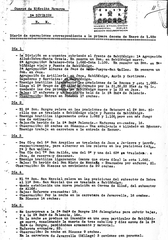 | Contenido: Diario de operaciones de la primera decena de enero de 1938. Diversos enfrentamientos con el ejército republicano, referencias a la cota 1062 y 1100. Se producen diferentes relevos de batallones y observación del bando republicano en Biescas. |