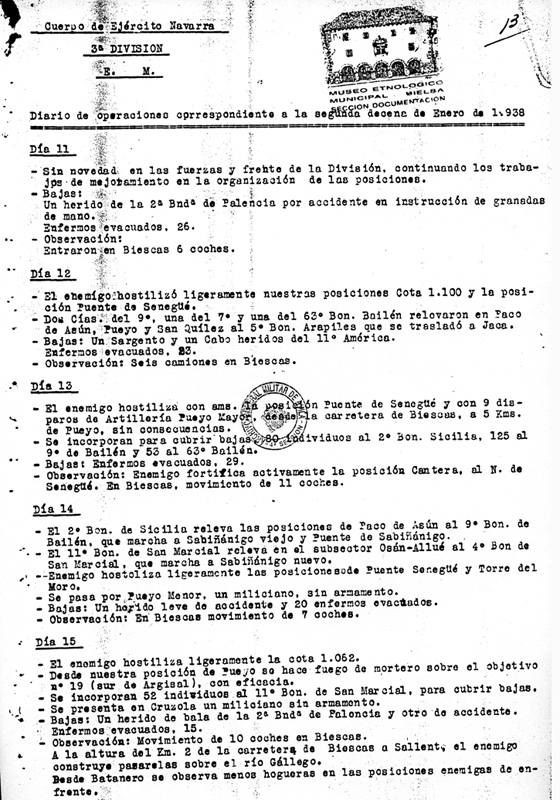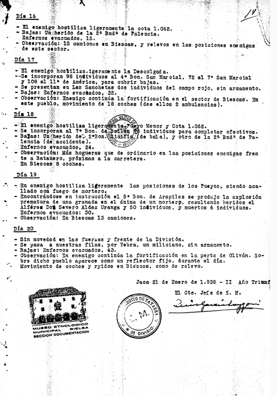 | Contenido: Diario de operaciones de la segunda decena de enero de 1938. Diversos enfrentamientos con el ejército republicano a la altura de Biescas y Senegüé. Hay tareas de observación y relevo de batallones. |