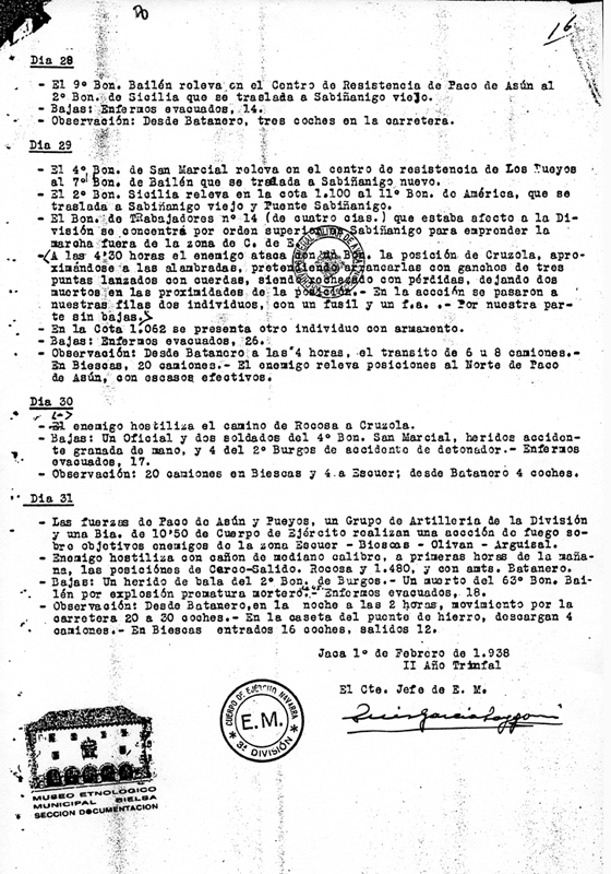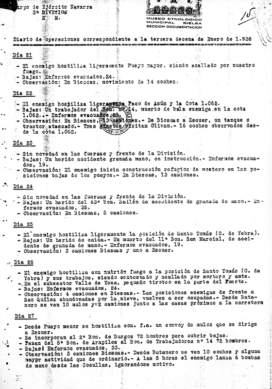 | Contenido: Diario de operaciones de la tercera decena de enero de 1938. Se producen enfrentamientos con el ejército republicano en el paco de Asún, cota 1062 y la posición de Cruzola, donde atacaron llegando hasta las alambradas intentando desmantelarlas. Se producen trabajos de observación de Biescas. |