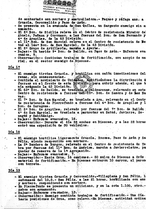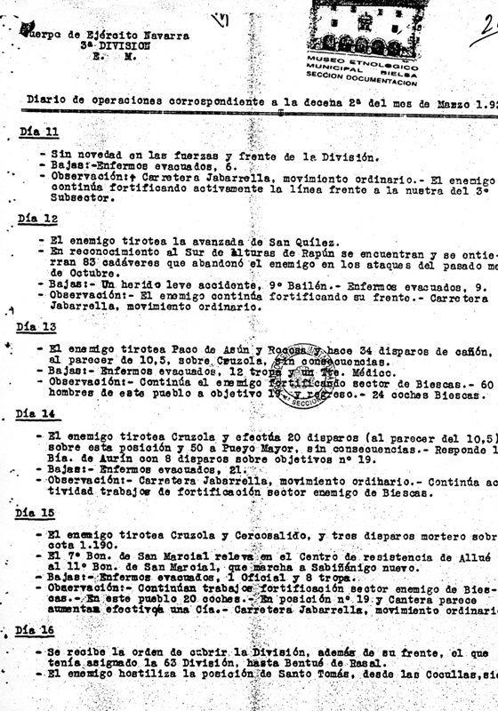 | Contenido: Diario de operaciones de la segunda decena de marzo de 1938. Se producen enfrentamientos con el ejército republicano en las posiciones de paco de Asún, Rocosa, Cruzola, Cercosalido, Santo Tomás, inmediaciones de Caldearenas y San Félix. Se producen relevos de batallones y deserta un Sargento republicano en la posición de San Quílez. |