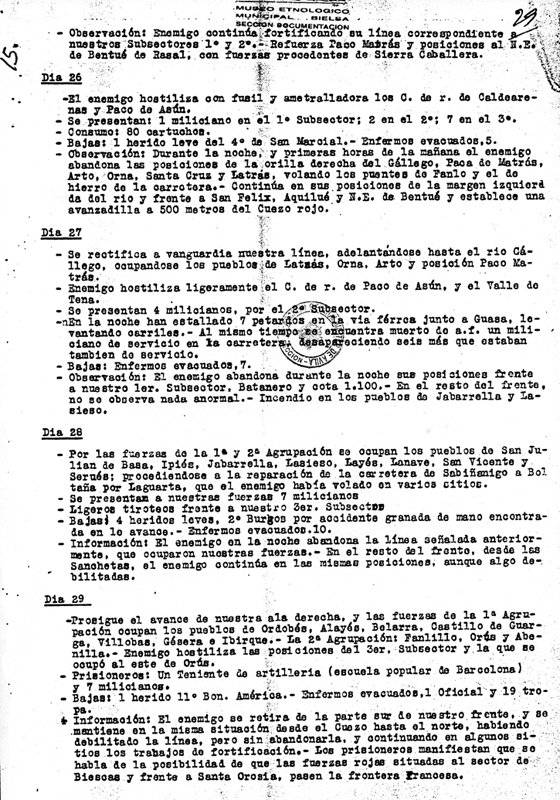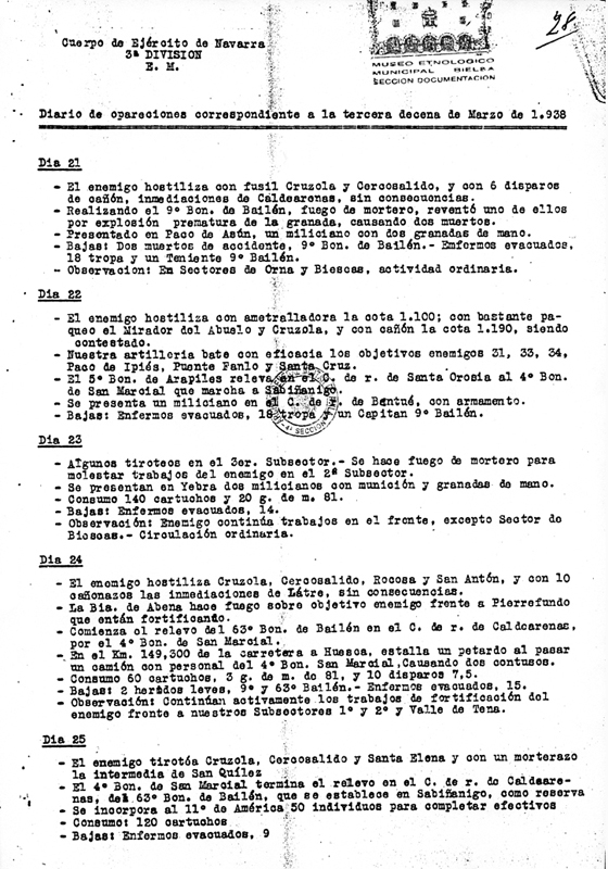 | Contenido: Diario de operaciones de la tercera decena de marzo de 1938. Se producen enfrentamientos con el ejército republicano por diferentes posiciones ante su progresiva retirada. El bando republicano abandona las posiciones de la margen derecha del río Gállego, volando los puentes de Fanlo y el de hierro de la carretera. Ante el progresivo avance de la 3ª División de Navarra se ocupan numerosos pueblos entre los días 26 y 30, algunos de ellos incenciados en la retirada. Los pueblos ocupados son Latrás, Orna, Arto, San Julián de Basa, Ipiés, Jabarrella, Lasieso, Layés, Lanave, Sanvicente, Serués, Ordobés, Alayés, Belarra, Castillo de Guarga, Villobas, Gésera e Ibirque. |