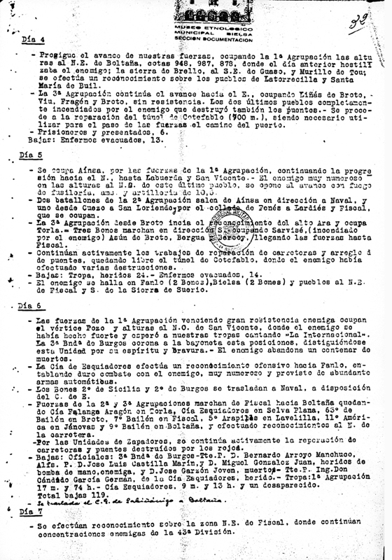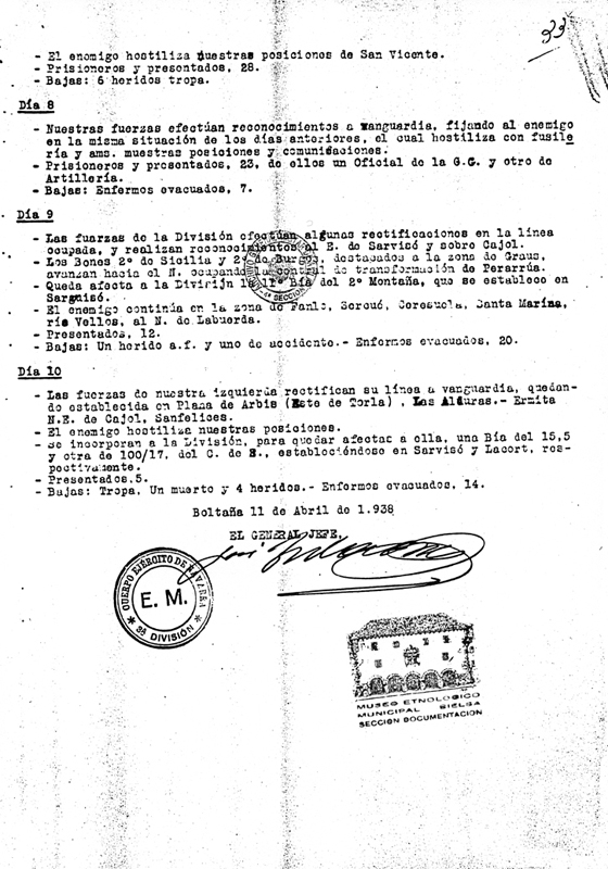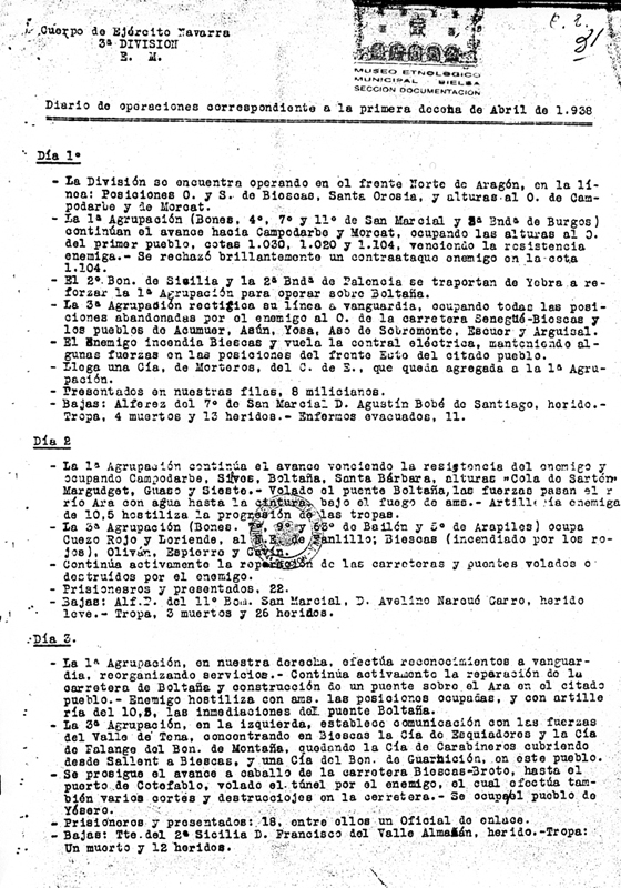 Contenido: Diario de operaciones de la primera decena de abril de 1938. Se producen numerosos enfrentamientos con el ejército republicano con gran número de bajas. Ante la retirada del bando republicano se ocupan los pueblos de Acumuer, Asún, Yesa, Aso de Sobremonte, Escuer, Arguisal, Campodarbe, Silves, Santa Bárbara, Boltaña, Margudgued, Guaso, Sieste, Loriende, Biescas, Oliván, Espierre, Gavín, Morillo de Tou, Linás de Broto, Viu, Fragen, Broto, Aínsa, Labuerda, San Vicente, Lardiés, Fiscal, Torla, Sarvisé, Asín de Broto, Bergua y Berroy. En esta retirada se incendian los pueblos de Biescas (volando también la central eléctrica), Fragen, Broto y Sarvisé, volando también los puentes de acceso. Se producen diferentes relevos de batallones y se traslada el cuartel general de Sabiñánigo a Boltaña.