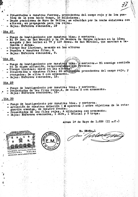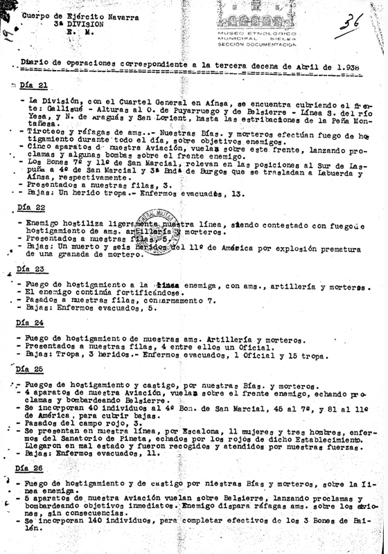 Contenido: Diario de operaciones de la tercera decena de abril de 1938. La 3ª División de Navarra se halla cubriendo el frente de Gallisué, al Oeste de Puyarruego y de Belsierre, línea Sur del rio Yesa, Norte de Araguás y San Lorién, hasta las estribaciones de Peña Montañesa.