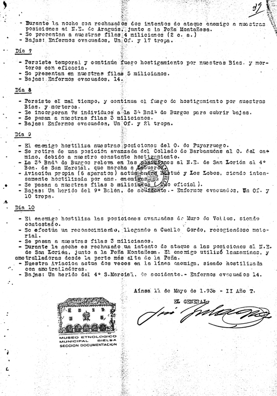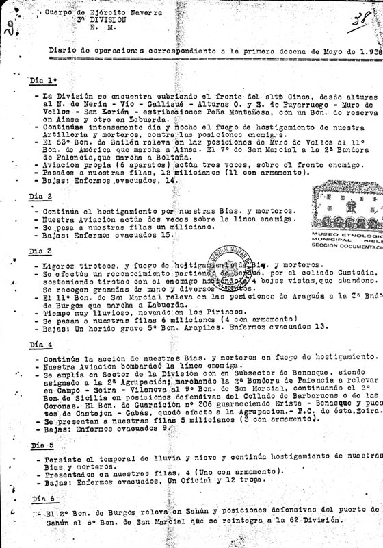 | Contenido: Diario de operaciones de la primera decena de mayo de 1938. Se mantienen las mismas posiciones. Se producen enfrentamientos con el ejército republicano en las inmediaciones de la Peña Montañesa. La aviación franquista protagoniza 4 días de bombardeos sobre las líneas republicanas. |