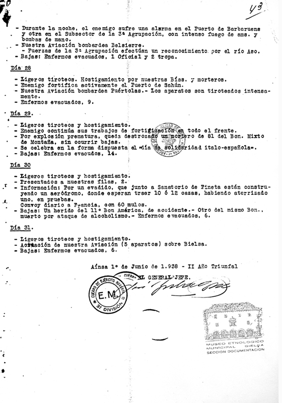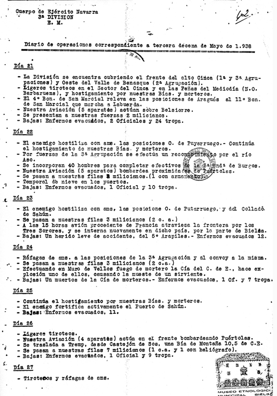 | Contenido: Diario de operaciones de la tercera decena de mayo de 1938. Se mantienen las posiciones y se producen bombardeos de la aviación franquista sobre Belsierre, inmediaciones de Puértolas, Puértolas y el día 31 sobre Bielsa. Prosiguen diversos enfrentamientos con el ejército republicano. En los trabajos de información se ha visto un avión que ha venido desde Francia y hay noticias de que en el Sanatorio de Pineta se está construyendo un aeródromo para 10 o 12 cazas. |