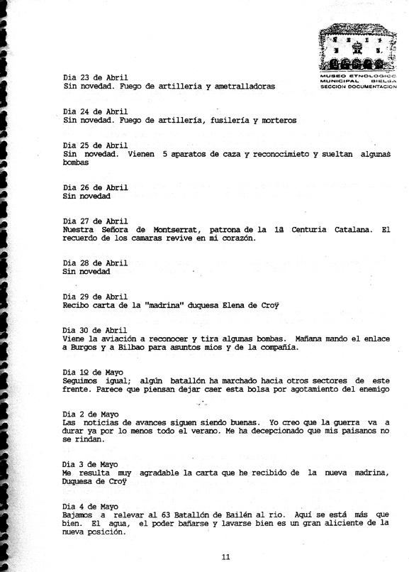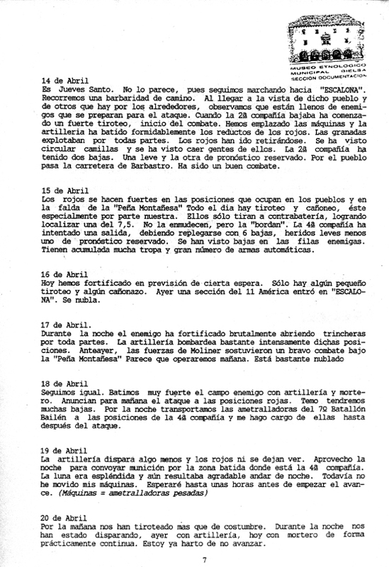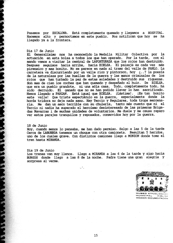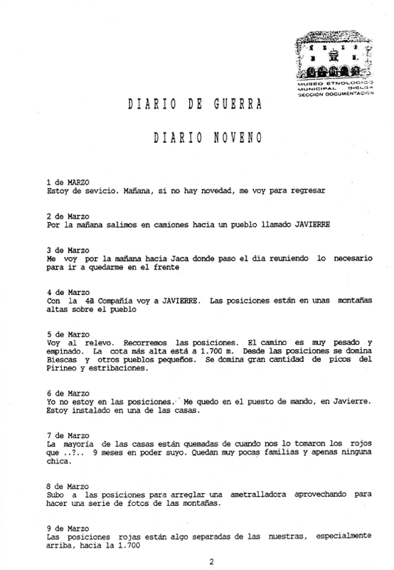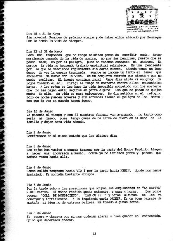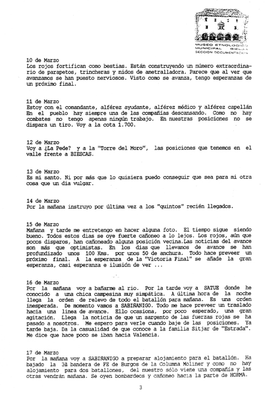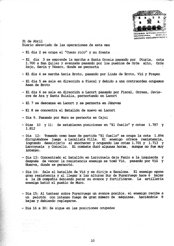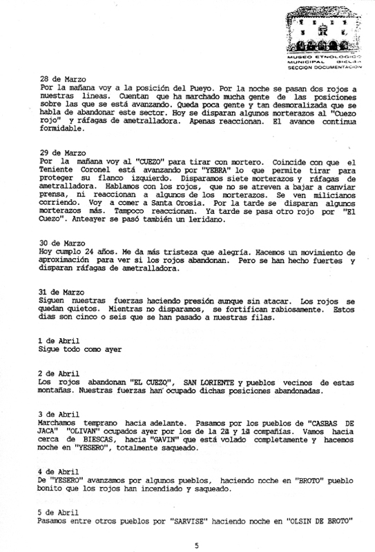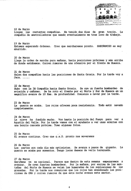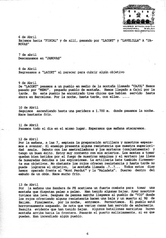 | Contenido: Notas tomadas por el Alférez durante su estancia en tierras altoaragonesas. En este diario se hace referencia a las diferentes operaciones del batallón al que estaba designado con numerosos comentarios sobre el devenir de la contienda bélica. |