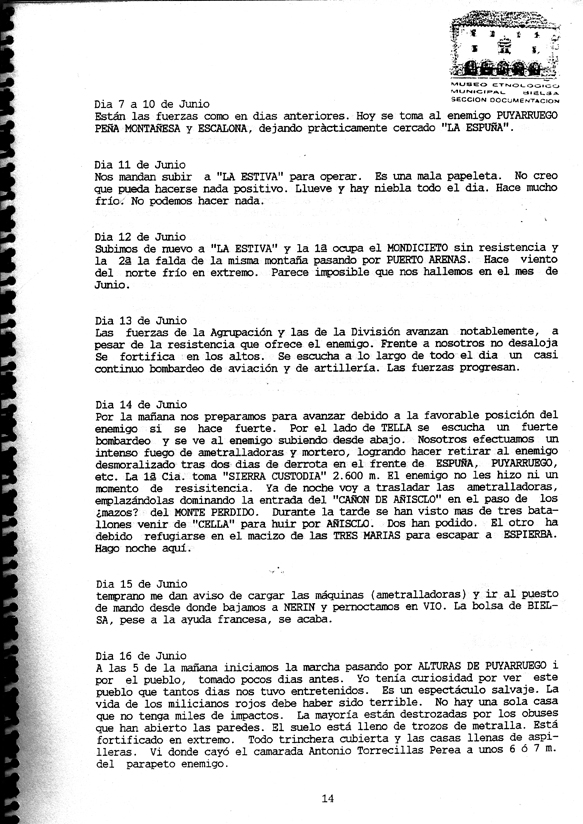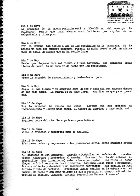 Hay una referencia a la muerte del alférez Antonio Torrecillas Perea en la entrada del 14 de mayo que coincide con el diario de operaciones, signatura ES-ARA-MB-002-003-001-020. |