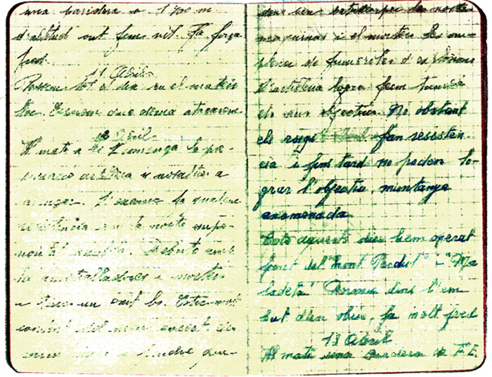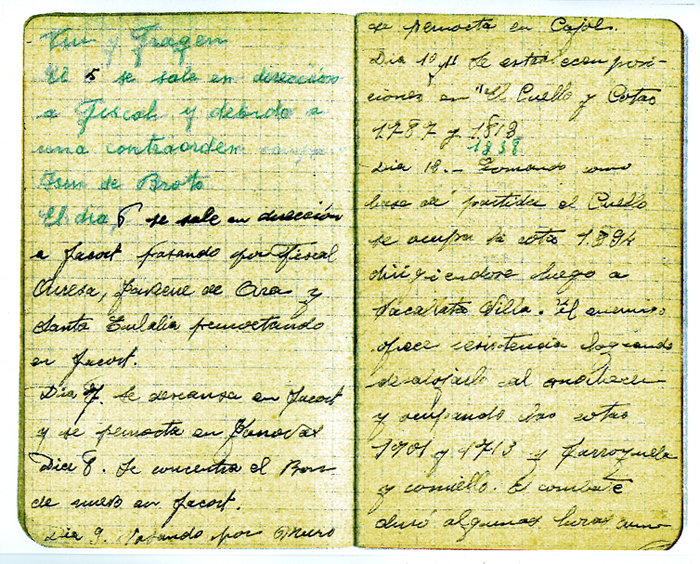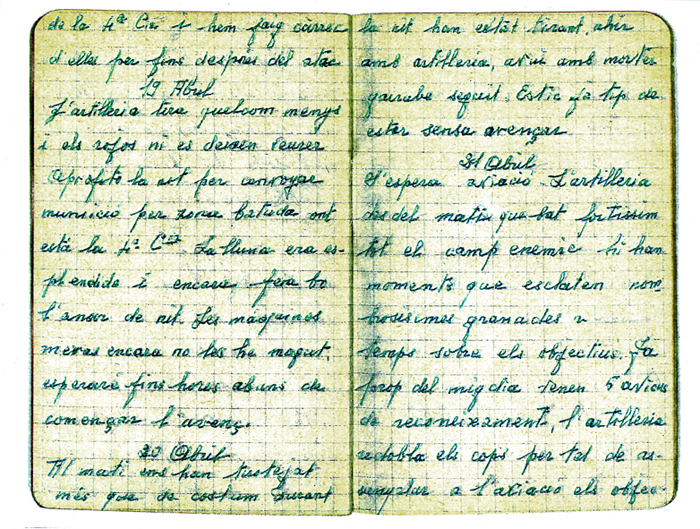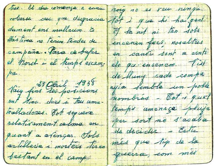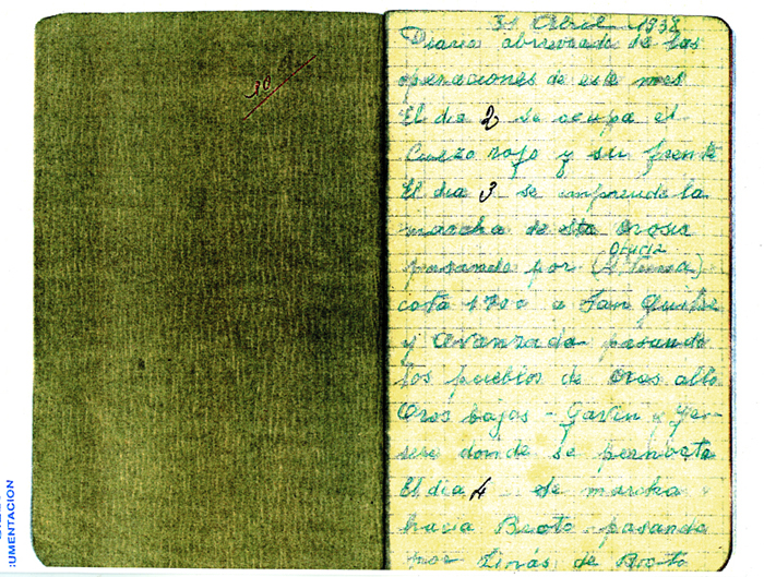 | Contenido: Diario abreviado del mes de abril de 1938, posiblemente extractado de los partes diarios del Batallón. |