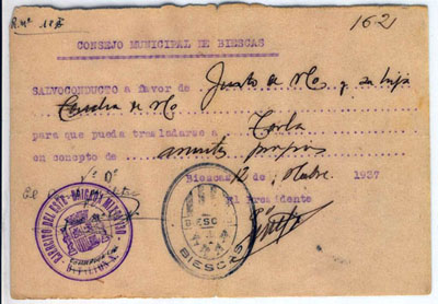 | Contenido: Salvoconducto del Consejo Municipal de Biescas a favor de Justo de No y su hija Concha de No para poder trasladarse a Torla. |