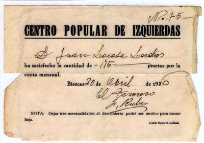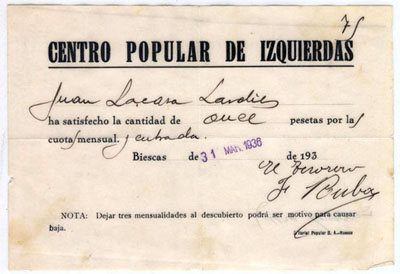 | Contenido: Recibos de las cuotas mensuales de Juan Lacasa Lardiés correspondientes a los meses de marzo y abril de 1936. El Centro Popular de Izquierdas era una organización que aglutinaba a todas las fuerzas del Frente Popular y de la que Juan Lacasa Lardiés fue presidente en Biescas. |