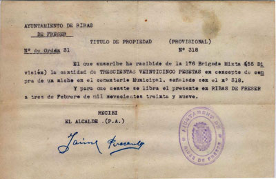 | Contenido: Recibo del Ayuntamiento de Ribas de Freser expedido por haber recibido el pago de la compra de un nicho del cementerio municipal, con título de propiedad municipal, por parte de la 176ª Brigada Mixta de la 55ª División. |