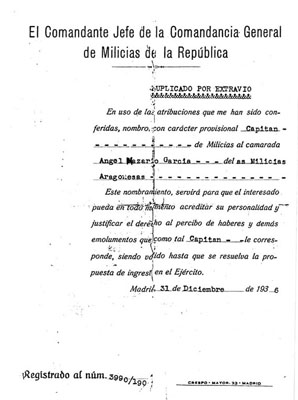 | Contenido: Nombramiento de Capitán de Milicias a favor de Ángel Mazario García, perteneciente Milicias Aragonesas. Expedido por el Comandante Jefe de la Comandancia Militar de Milicias de la República. |