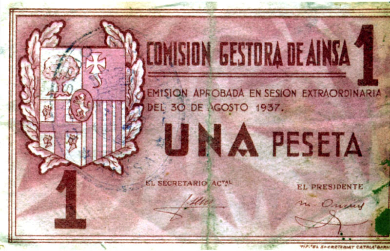 | Contenido: Billete de una peseta emitido el 30 de agosto de 1937 por la Comisión Gestora de Aínsa. Esta clase de moneda solo tenía validez en el término municipal donde era expedido. |