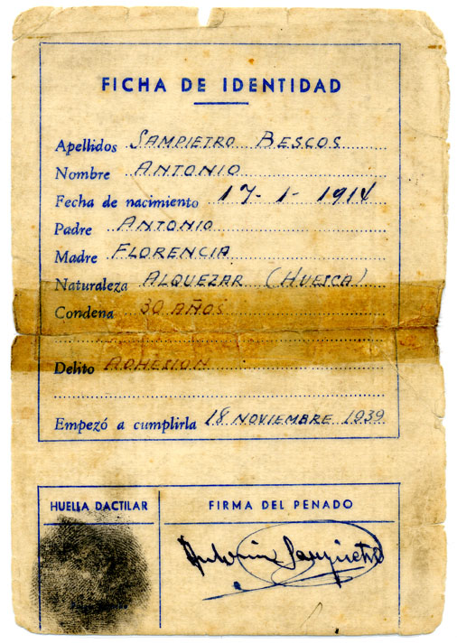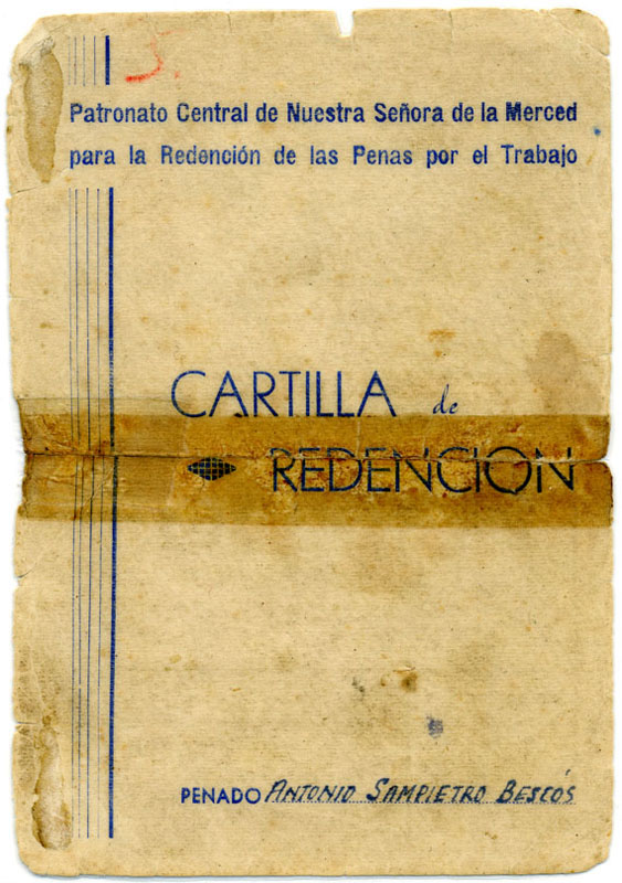 | Contenido: Cartilla de redención de las penas de Antonio Sampietro Bescós, condenado a treinta años por el delito de adhesión a la rebelión. Ficha identificativa del Patronato Central de Nuestra Señora de la Merced para la Redención de las Penas por el Trabajo. |