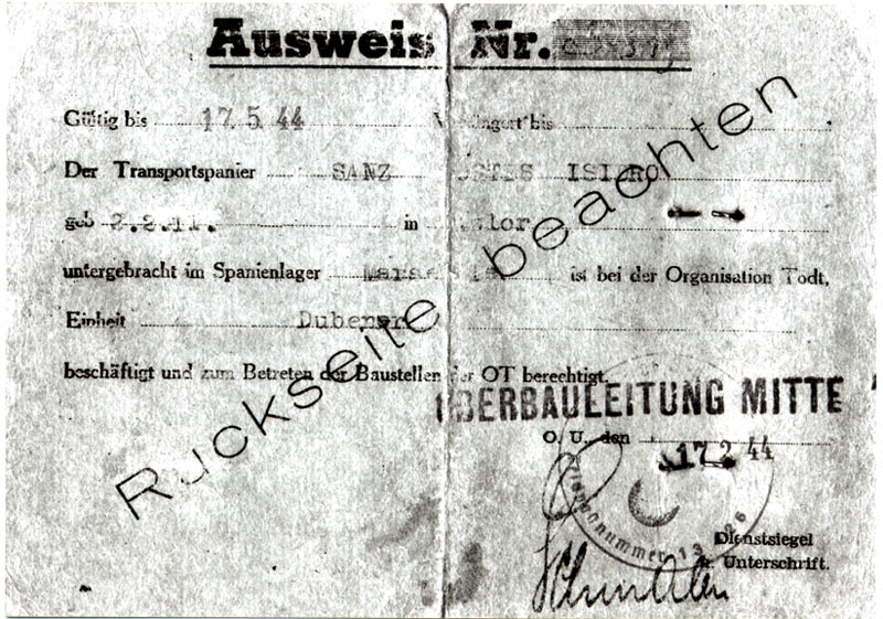 Nota: Contiene fotografía de Isidoro Sanz Justes y firma y sello del mando militar alemán. Publicado en GASCÓN RICAO, Antonio. La Bolsa de Bielsa: el heroico final de la república en Aragón. Huesca, DPH, Área de Cultura, 2005, p. 223. |