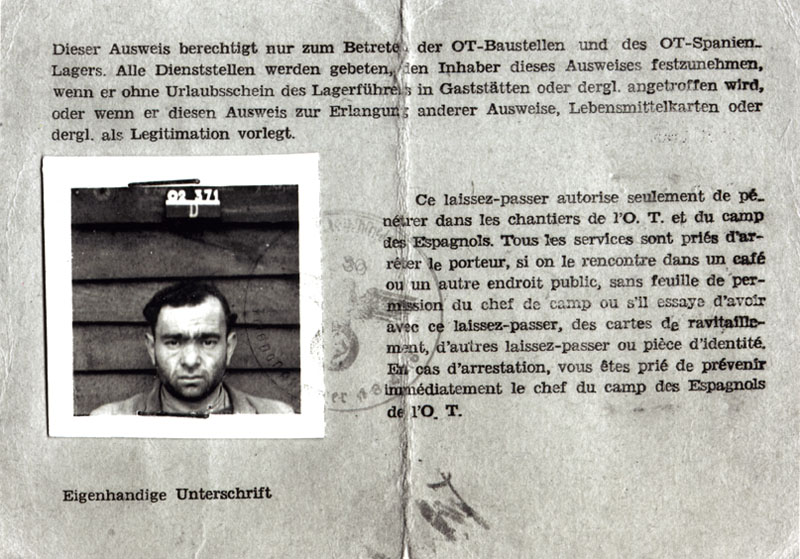 | Contenido: Salvoconducto de Isidoro Sanz Justes, del campo de refugiados españoles. Expedido durante la ocupación alemana de Francia, escrito en ambas lenguas. |
