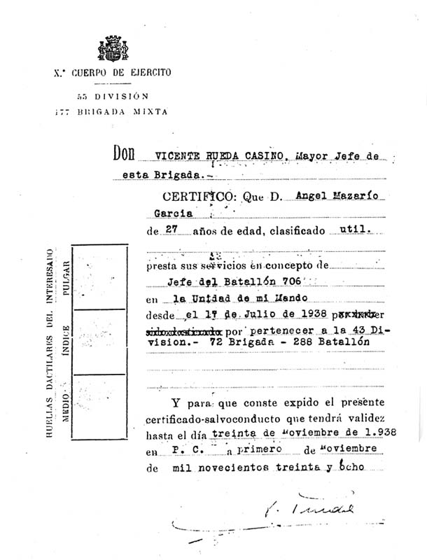 | Contenido: Certificado expedido por el jefe de brigada Vicente Rueda Casino a favor de Ángel Mazario García, acreditando que es jefe del Batallón 706º desde el 17 de julio de 1938, fecha en la que se incorporó procedente del Batallón 288º de la 72ª Brigada Mixta de la 43ª División. |
