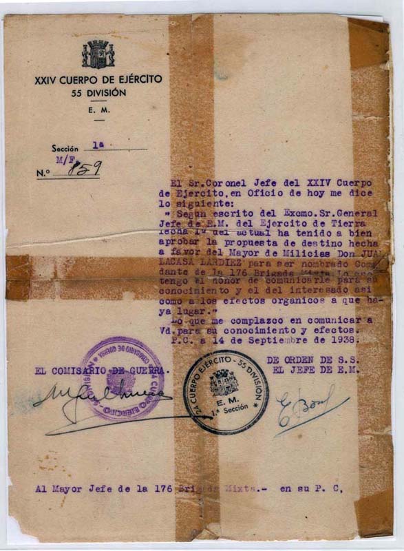| Contenido: Escrito dirigido a Juan Lacasa Lardiés nombrándole comandante de la 176ª Brigada Mixta. |
